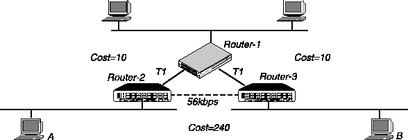 Figure 11-4 shows how costs are used to direct traffic over high-speed links. For example, if Router-2 in Figure 11-4 receives packets destined for Host B, it will route them through Router-1 across two T1 links (Cost=20) rather than across one 56kbps B-channel to Router-3 (Cost=240).