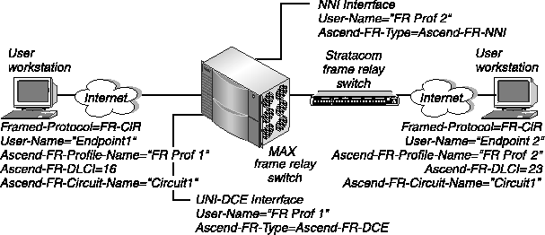 Setting Framed-Protocol=FR-CIR specifies that the packets the MAX transmits and receives over the link do not go through the MAX unit's bridge/router. Setting the Ascend-FR-Circuit-Name attribute to the same value in both user profiles tells the MAX to pass packets transparently between FR Prof 1 (DLCI 16) and FR Prof 2 (DLCI 23).