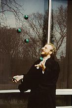 Stephen Coughlan started juggling as a hobby about five years ago, and does three clubs (working on making his backcrosses solid), and (as the photos shows, as long as you can't see the strings holding them up!) five balls.