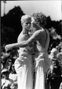 Perhaps the most extraordinary and original group at this festival is the Berlin-based duo of Tomas Weiss and Niva Howard who call themselves The Living Statues. Dressed in white Grecian robes, their bodies whitewashed and even their hair spray-painted white they set up their mock columns in absolute silence and then, climbing up, freeze into classical poses. What follows is an extraordinary routine of great subtlety and deftness which relies on its humour, charm and beauty on the improvisational interaction between the silent and very slowly moving statues and the spectators.