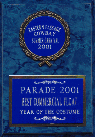 To commemorate our participation in the Eastern Passage Days Parade on the August 11th we were given a plaque from the Eastern Passage Cowbay Summer Carnival 2001 Parade 2001 for the “Best Commercial Float Year of the Costume" We were very surprised and pleased to have won this award.