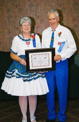 Burnley has always been at Shirley's side, making sure the dancers always had a cup of tea or coffee beforegoing home, and always filling in as a dancing partner for solo dancers. In 2004, due to health problems, Shirley wasunable to continue calling. We thank you for the many years of dedication. Awards were given to Shirley & Burnley inabsentia, at the Festival/05 in Yarmouth, which included, Service Award, Club Longevity and Dancer Longevity.