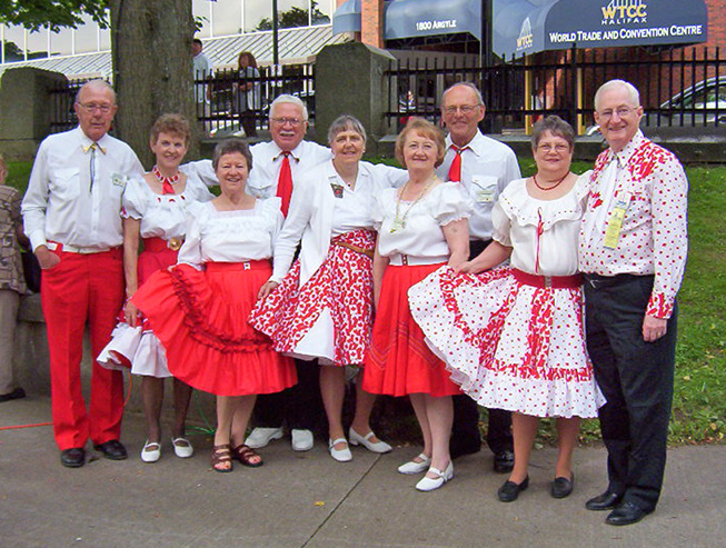 July 1 dawned warm and clear - excellent weather for strutting our stuff on the Halifax Parade Grounds. Our volunteers put on a good show for the assembled crowd. From left: Curtis and Pat Mercer, Inge and Bob Rouhoniemi, caller Dottie Welch, Joan and Don Embree, Judy and Dave Nickerson.