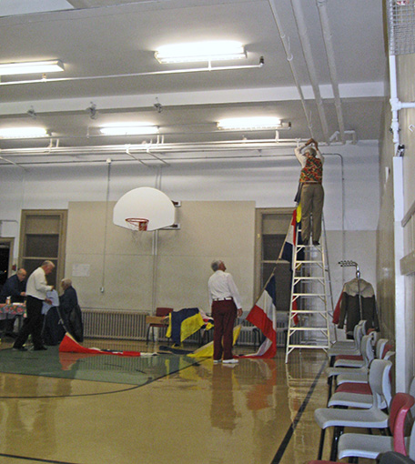 Hanging the naval flags before the dance. Hint: never look down!