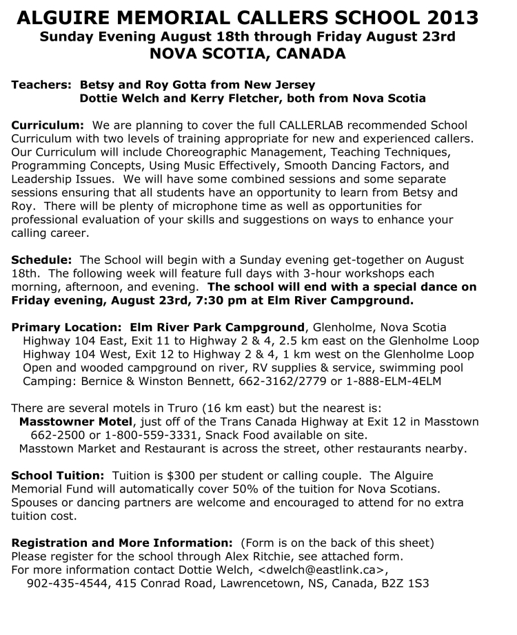 The next Alguire Memorial Callers School will be held in August 2013 at the Elm River Campground in Glenholme. The first page of the poster advertizing the school appears below; the Calendar of Events will lead you to the complete poster, including registration information.
