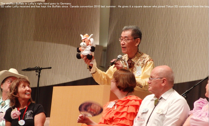 Remember the Halifax National Festival 2010 closing ceremonies? A cute little bull named Maverick was presented to the participant who had travelled farthest to reach Halifax - in this case, Lofty Yamasaki from Japan. Your Editor recently learned that Lofty passed Maverick along at the 50th All Japan Square and Round Dance Convention [check "http://www.squaredance.or.jp/convention/2011/50thconv-eng.html"], where he was known as the Stuffed Buffalo", to a couple from Germany. Where do you suppose the little bull/buffalo is now?
