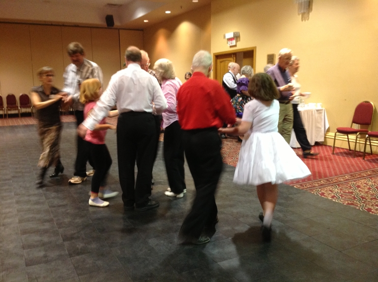 So, isn't square dancing just an old-folks's sport? Guess again! Two "boys" in this square are dancing with their granddaughters.