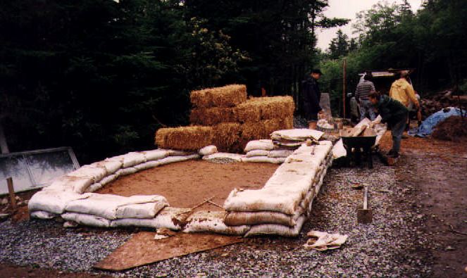 We used an experimental earth bag system which evolved from local