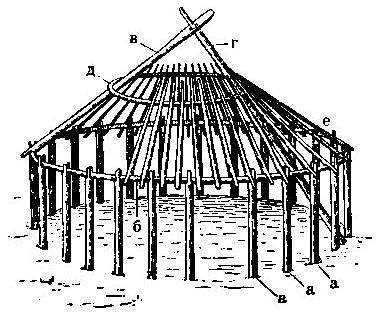 The kibitka-like tent in which a simplified wall of vertical posts or