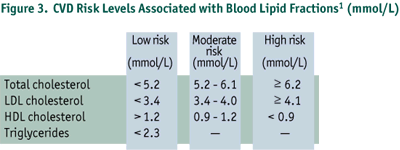 CVD risk levels associated with the various lipid components are given in Figure 3. These values, taken from international consensus conferences and epidemiological and clinical studies, are accepted measures of population risk for development of CVD.