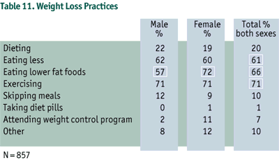 When asked whether they saw themselves as overweight most respondents with a BMI over 25 believed that they were overweight (Table 10). However, only 39% of this group were trying to lose weight, with more women (48%) than men (31%) attempting weight change. Men and women over age 65 who were overweight were less likely to be attempting weight loss than their younger counterparts. Finally, a percentage of men and women with BMI values less than 25 (indicating a weight that is healthy or low) believed that they were overweight (14% of men and 30% of women). Of concern are the 24% of women 18- 34 years old and 18% of women 35-64 years old with a BMI <25 who reported trying to lose weight.