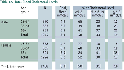 Blood cholesterol in the NSHS95 was analysed using blood samples collected for all clinic subjects after a minimum eight hour fast. Table 12 presents mean total blood cholesterol levels for all age and sex groups, as well as the percentage of these groups whose cholesterol levels fell in the various risk categories outlined in Figure 3. In a similar fashion, LDL cholesterol, TRIG, and HDL cholesterol values are presented in Tables 13, 14, and 15, respectively.