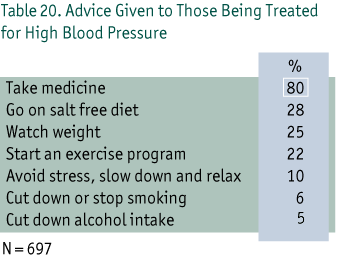 Of the 697 adults who were told they had high blood pressure and were prescribed treatment, 80% reported being advised to take medication to control their condition. Other less frequent responses included salt restriction, weight control, exercise, stress control, smoking cessation, and consuming less alcohol (Table 20).