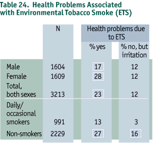 Nearly a quarter of Nova Scotians indicated that ETS created health problems for them, with more women (28%) than men (17%) being affected (Table 24). An important policy issue is the effect of ETS on the health of non-smokers. Twenty-seven percent of non-smokers believed they were experiencing health problems, and another 16% reported experiencing irritation from exposure to ETS.