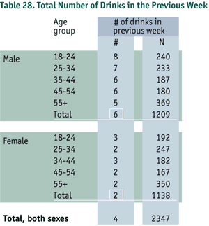 When asked to report the number of drinks consumed in the past week, men consumed on average six drinks, three times the level reported by women (Table 28).