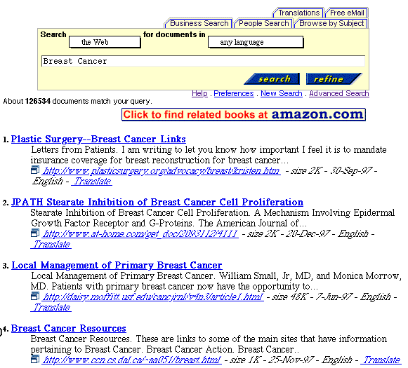 Voyez, par exemple, les résultats ci-dessous, obtenus avec le critère de recherche 'breast cancer' (cancer du sein) avec AltaVista. Remarquez le nombre de pages trouvées : 126 534!