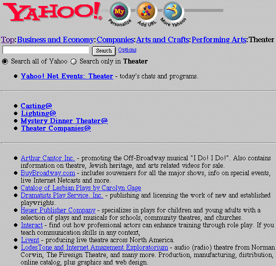 Cette page s'appelle Business and Economy: Companies: Arts and Crafts: Performing Arts: Theatre (Affaires et économie; Entreprises; Arts et artisanat; Arts de la scène; Théâtre), cependant, vous auriez pu y parvenir en choisissant d'abord Arts and Humanities, (Arts et sciences humaines) puis en suivant les références croisées appropriées. Remarquez que, comme Alta Vista, Yahoo vous donne aussi le titre de la page (complet avec un lien actif vers la page en question) ainsi que deux lignes tirées du début du document.