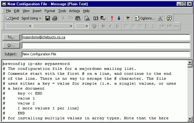 Last time we took a look at the basics of a list server and its uses. Let's delve a little deeper this time and see how we can make it work for you. The rest of the article will deal specifically with Majordomo and its configuration since that is the list server software that CCN is running. If you ended up here without reading Part I, I'd suggest you go back and browse through it before continuing. The key to using Majordomo is learning the list commands and the configuration options. The commands allow you to set up your list or your subscription to the list and the configuration options tell Majordomo how to run your particular list. There are many Majordomo commands but the easiest and most useful is "help". If you send email to majordomo@chebucto.ns.ca with the single word "help" (without the quotes) in the message area you get the help file sent back to you. The help file gives you lots of useful information if you are a member of a list or if you wish to become a member. If you are a list owner however, you have a different set of commands available, most of which are accessed by making changes to the configuration file. By changing various settings in the configuration file you can change the way the list behaves. This is what I was referring to in Part I when I said that there were many different types of lists because lists are really all the same - it'’s just the behaviour that differs. The configuration file is quite large so I'm not going to go into detail on every line item but I would like to hit the high points. Feel free to refer to it while you read. Here is a sample for you to examine. Note that any line starting with a pound sign ("#") is a comment. This means that the first fifty-some-odd lines are comment lines explaining some of the features of the configuration file. Some Important ParametersThe most important parameters are the passwords. A person who has access to your passwords can change the options on your list and/or gain control of it. There are two passwords: the administrative password, admin_passwd, and the approval password, approve_passwd. You should guard these passwords with your life or at least (archival link Password Safe from archive link Counterpane Systems.