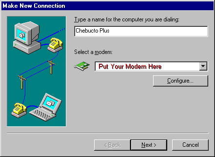 Here is the setup information for Windows 95, Windows 98 and Windows ME. You will need to have your Chebucto Plus password before proceeding. You may also require your Windows 95, 98 or ME CD-ROM (or disks). Clicking on a screen shot will show a larger version.
